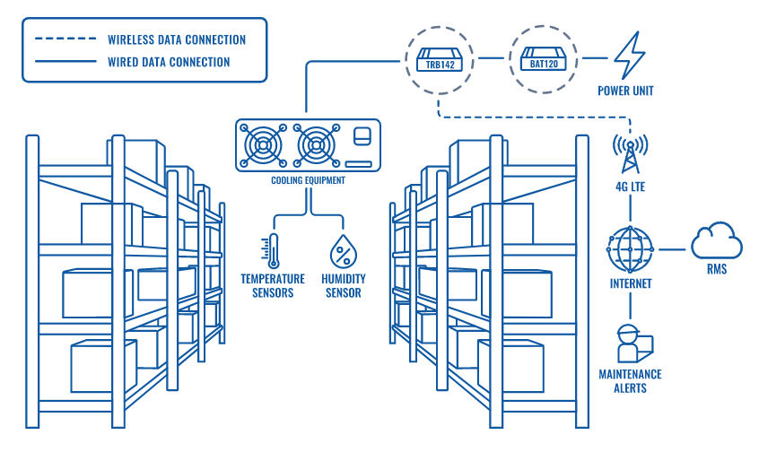 Stalni protok podataka u FMCG-u je od vitalnog značaja jer ako temperatura i vlažnost dosegnu određenu točku, cjelokupna zaliha može biti ugrožena. Rashladna oprema sa senzorima temperature i vlage povezana je s industrijskim pristupom Teltonika Networks TRB142 za pomno praćenje FMCG skladišta. TRB142 zatim bežično šalje sve informacije natrag u centar za nadzor, gdje se pomno prate. Međutim, ta veza može biti prekinuta zbog nestabilnih uvjeta napajanja.