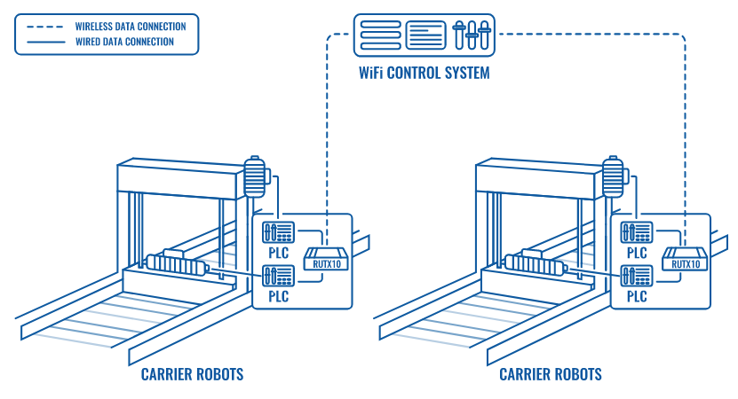 Način da spriječi prekid komunikacije bio je dizajn infrastrukture povezivanja robota nositelja s bežičnim router-om (usmjerivačem) visokih performansi na umu: Teltonika industrijskim router-om (usmjerivačem) RUTX10. RUTX10 je povezan s parom PLC-ova koji kontroliraju robote nosače i bežično primaju i prosljeđuju upute iz kontrolnog sustava tvornice za premazivanje.